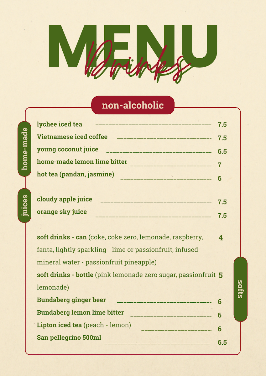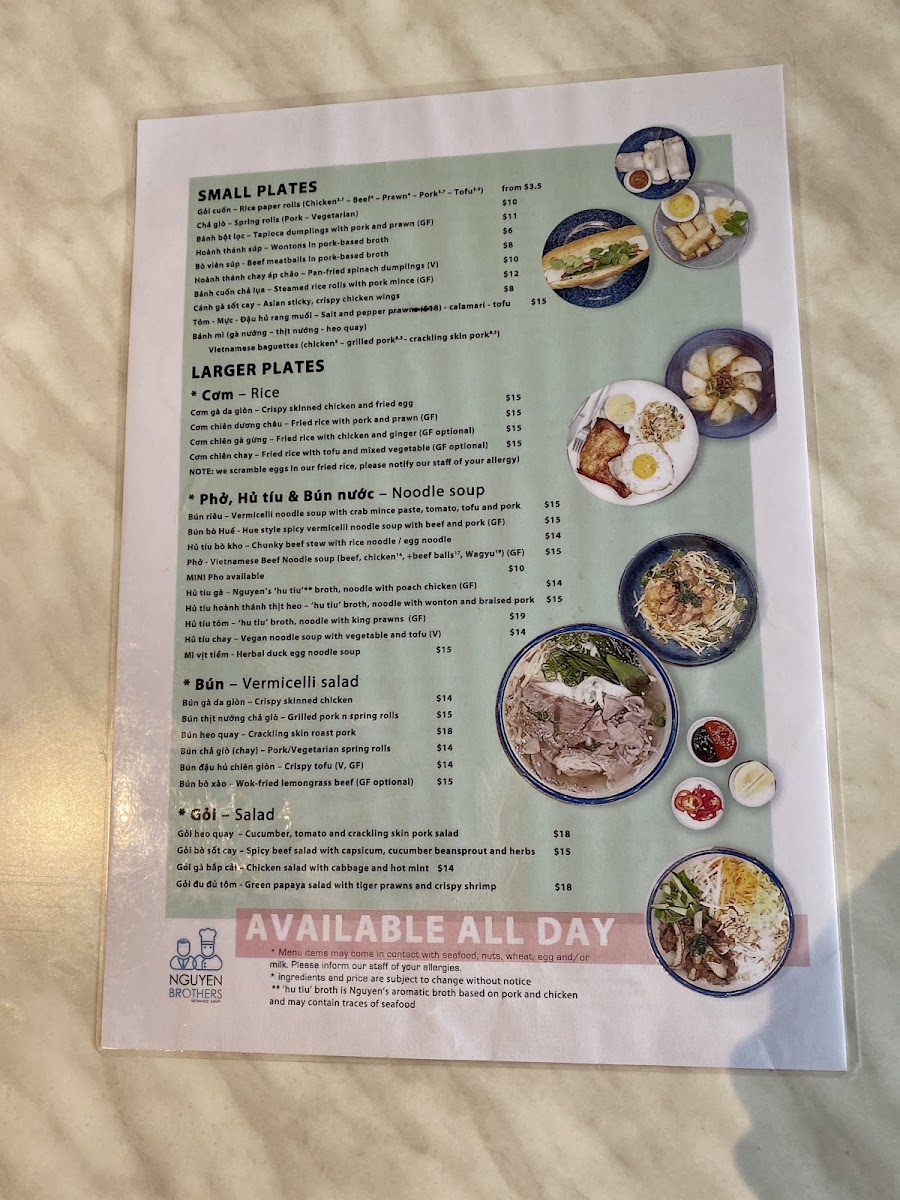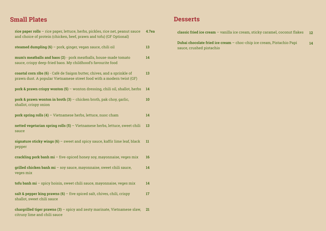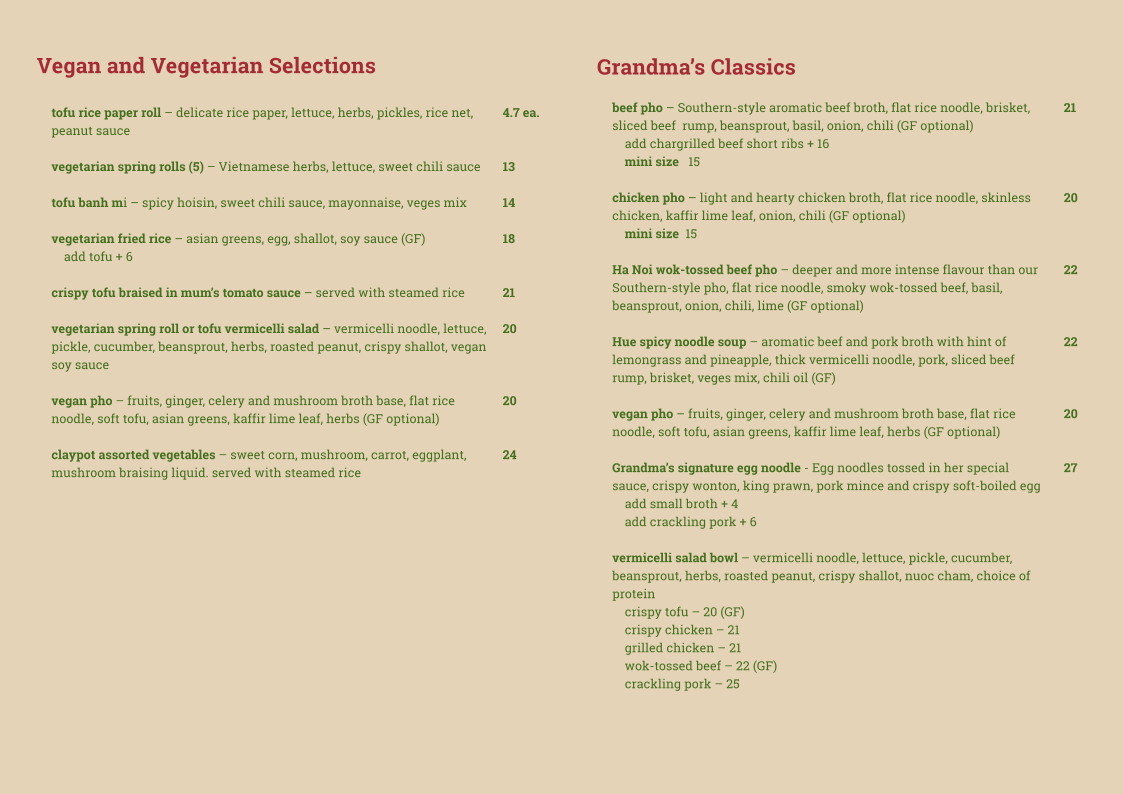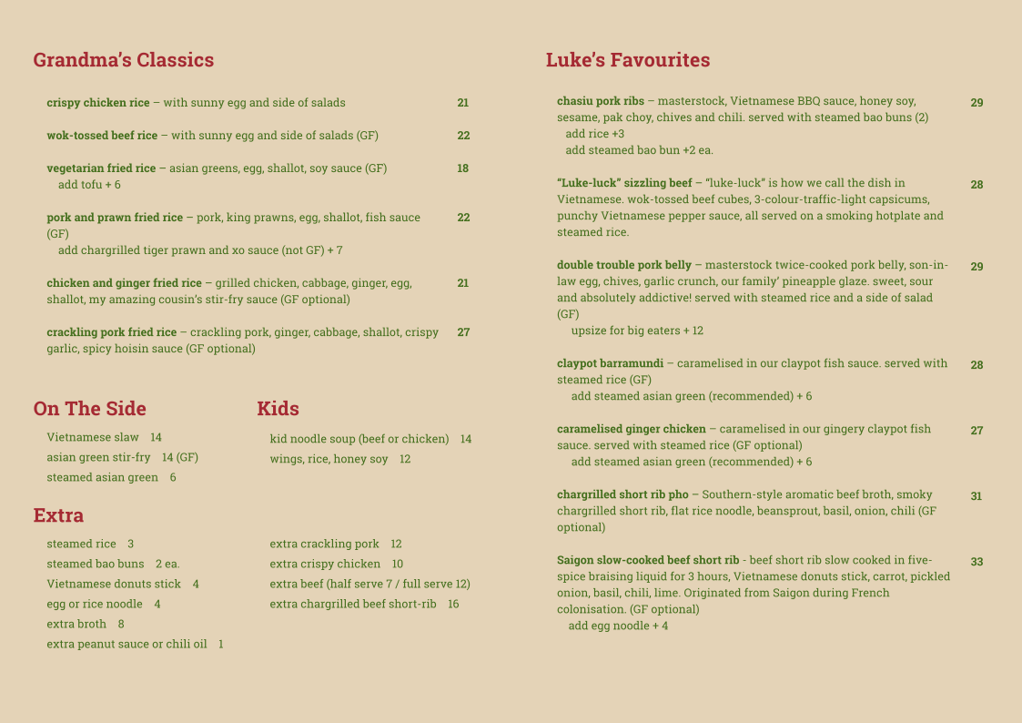 From a reviewer’s perspective, the menu at Grandma Đặng offers a well-rounded and comforting selection that highlights both traditional Vietnamese flavors and creative house specialties. The starters set the tone with fresh options like RICE PAPER ROLLS and savory bites such as STEAMED PORK GINGER DUMPLINGS (6) and PORK & PRAWN CRISPY WONTON (5), while unique items like COASTAL CORN RIBS (6) add a modern twist. The heart of the menu lies in Grandma’s classics, where staples like BEEF PHO, MINI BEEF PHO, and HANOI WOK TOSSED BEEF PHO deliver familiar, aromatic comfort. For those seeking something richer, Luke’s favourites-including CHASIU PORK RIBS, "LUKE-LUCK" SIZZLING BEEF, and CLAYPOT BARAMUNDI-bring bold, indulgent flavors. The menu also caters thoughtfully to families and dietary preferences, with kid-friendly dishes like KID NOODLE SOUP (BEEF OR CHICKEN) and plant-based options such as CRISPY TOFU BRAISED IN MUM'S TOMATO SAUCE and VEGETARIAN SPRING ROLLS (5). To finish, desserts like CLASSIC FRIED ICE CREAM provide a nostalgic sweet touch. Overall, the menu feels diverse and inclusive, balancing tradition with variety, even though pricing details are not prominently highlighted.